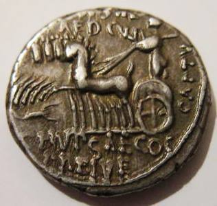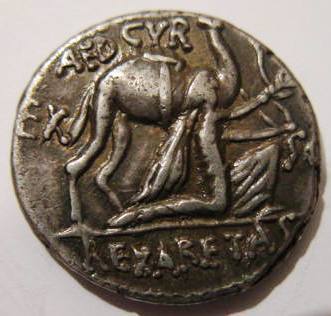 Quatre années plus tard, en 58, M. Aemilius Scaurus, alors édile, fit réaliser des deniers où le roi nabatéen Arétas III, agenouillé à côté d’un chameau et identifié par son nom et son titre, tend une palme à un personnage hors-champ. Scaurus faisait allusion à une expédition qu’il avait conduite contre les rois de Pétra pour le compte de Pompée en 62, et par laquelle il avait procuré à Rome la soumission d’Arétas en même temps qu’un important butin.