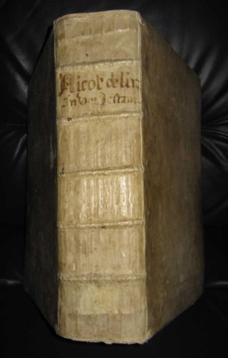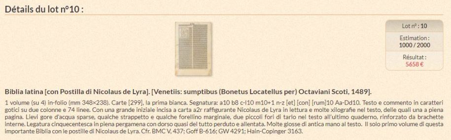 Volumi I-III: Venezia: Boneto Locatello, 8 agosto 1489 ; Volumi IV-V: Venezia: Paganino Paganini, 18 aprile 1495 Quattro parti in cinque volumi in-folio (mm 330×240). I: Carte [298] (di 299, manca carta a1 bianca). Segnatura: a10 b8 c-l10 m10+1 n-z10 &10 [con]10 [rum]10. II: Carte 292. Segnatura: aa-zz10 &10 [con]10 [rum]10 aaa10 bbb10 ccc12. III: Carte 244. Segnatura: AA-YY10 ZZ10 &&10 [con]10. IV: Carte 176. Segnatura: VVV-ZZZ8 1-188. V: Carte 210. Segnatura: 19-438, 4410. Per un totale complessivo di 1221 carte. Testo in carattere gotico su due colonne, racchiuso nel commento. Illustrazioni xilografiche nel testo. Ottimo esemplare. Legature uniformi della metà del XX secolo in mezza pergamena con piatti in carta marmorizzata. Set composito composto da 3 volumi (di 4, manca l’ultimo volume contenente l’Apocalisse) dell’edizione della Bibbia con le postille di Nicolaus de Lyra stampata da Boneto Locatello nel 1489 e dai due volumi di cui si compone l’edizione delle postille del De Lyra data alle stampe da Paganino Paganini nel 1495. Nel I e III volume numerose belle figure in xilografia, che hanno l’importante primato di essere le prime illustrazioni ad una Bibbia stampate in Italia. Tra queste sono due splendide immagini che rappresentano la costruzione dell’arca di Noè. La prima pagina dei 5 tomi ha una splendida inizale xilografica che ritrae un monaco seduto davanti un leggio. Magnifica edizione, la prima della Bibbia in cui vengono stampate insieme la glossa ordinaria e interlineare e le Postilla perpetuae in universa Biblia di Nicolò de Lira, ampio ed esaustivo commento all’intero testo biblico che fu più volte ristampato nel corso del Quattro e Cinquecento. Nelle prime cinquanta postille Niccolò de Lira tratta il senso perpetuo o letterale delle Sacre Scritture, nelle successive trentacinque il senso mistico o morale. Volumi I-III: HC 3168*; GW 4291; BMC V 437; IGI 1688; Goff B-616; Volumi IV-V: HC 3174*; GW 4283; BMC V 458; IGI 1691; Goff B-608.