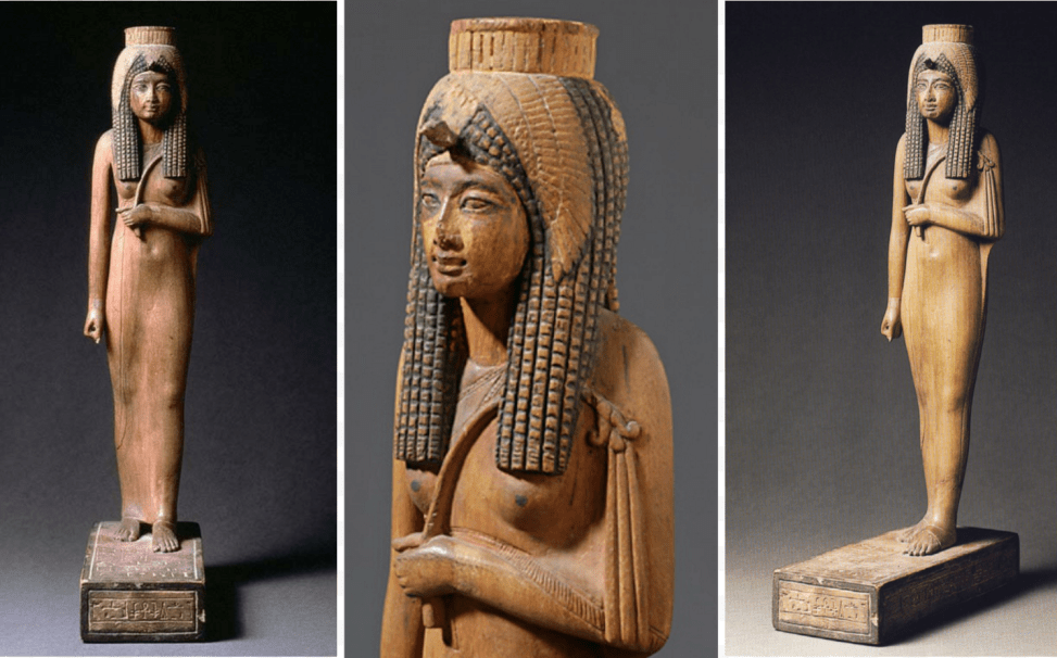 Dédiée par l’ouvrier Djéhoutyhermaketef qui espère en retour une belle vie et une belle sépulture, cette statuette incarne l’épouse du premier roi du Nouvel Empire. C’est l’un des exemples les plus séduisants de la petite statuaire en bois de l’époque pharaonique. Attitude, atours vestimentaires et coiffure sont empreints d’élégance. La robe de lin fin laisse entrapercevoir l’anatomie de la souveraine, témoignage de l’idéal féminin au temps de Ramsès II, là où la statuette a été sculptée.