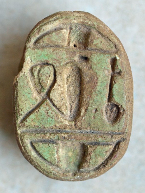 6 GRAND SCARABÉE orné sur le plat de hiéroglyphes. Faïence verdâtre. Usée. Long. 3,7 cm