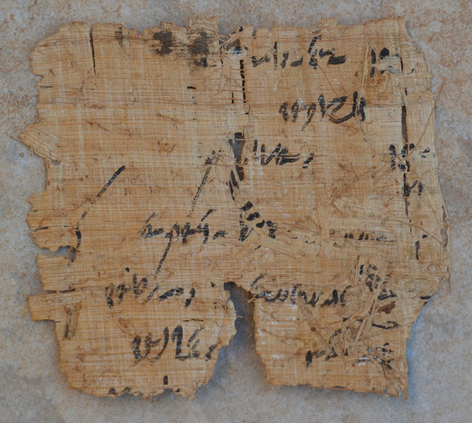 La face qui semble être la plus cohérente, et que j’appellerai en conséquence « recto » bien qu’elle soit écrite curieusement du côté transfibral du papyrus, présente les restes de deux colonnes dont j’ai énormément de mal à comprendre l’organisation. Celle de droite comporte des mentions dont la lecture et même la nature m’échappe en partie, la seule dont je suis à peu près sûr est à la huitième et dernière ligne : p3 dny (n) hsmn « la taxe du natron », ce qui est peu courant. On remarque aussi une indication chronologique à la cinquième ligne : ibd-3 smw sw ‘rq, c’est-à-dire le 30 Epiphi. Pour le reste, il y a surtout des chiffres et des fractions, ainsi que le signe wp-st « détail » à plusieurs reprises et qu’on trouve constamment dans les comptes. La seconde colonne est encore plus désespérante, il semble y avoir des noms propres (dont un nom grec en patronyme, semble-t-il, à la ligne 5 : Twrny ?, peut-être Dôriôn ou quelque chose de semblable), mais sans certitude …